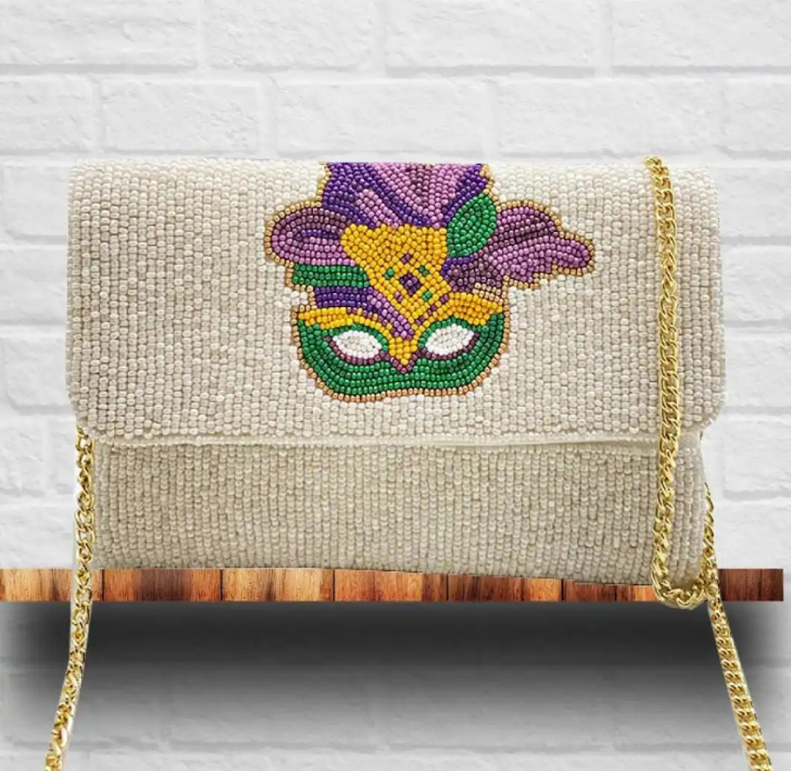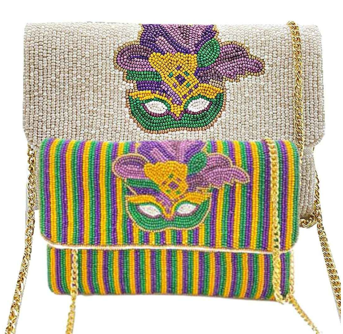 • Feature: The collection includes hand-beaded envelope-style clutches featuring the traditional Mardi Gras mask motif and the iconic purple, green, and gold colors.